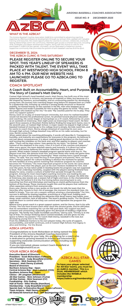The Arizona Baseball Coaches Association (AzBCA) is committed to advancing coaching expertise by offering professional development through our annual clinic, packed with valuable training and resources. We create opportunities for coaches to connect, collaborate, and build lasting relationships within the community.